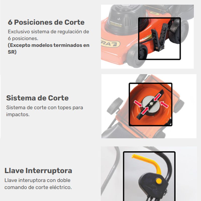 Tipo: Con salida trasera Potencia: 3/4 HP Potencia Máx. Útil: 1300 Watts Ancho de Carcasa: 390 mm Rueda Delantera: 135 Rueda Trasera: 160 Posiciones de Corte: 6 Posiciones Sup. a Cortar: Hasta 500 m²
