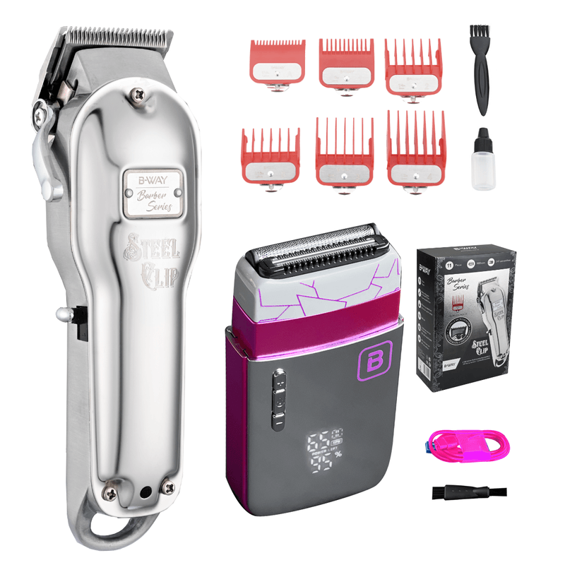 COMBO PROFESIONAL BWAY STEEL CLIP + AFEITADORA SPLIT. Llevá tu rutina de cuidado personal al siguiente nivel con este combo completo. Ideal para quienes buscan precision potencia y practicidad tanto en cortes de pelo como en afeitado. CORTADORA DE PELO INALAMBRICA BWAY STEEL CLIP Potencia precision y libertad de movimiento. Ideal para cortes de pelo y barba con acabado profesional. Funcionamiento inalambrico para mayor comodidad. Incluye 6 peines guia desde 0 8 mm hasta 13 mm. Potente bateria con hasta 240 minutos de uso con solo 4 horas de carga. Diseno ergonomico resistente y de facil manejo. Accesorios incluidos aceite lubricante cepillo de limpieza protector de cuchilla cable USB de carga. AFEITADORA PROFESIONAL BWAY SPLIT Tecnologia precision y resistencia al agua. Motor de alto rendimiento de 7500 rpm con 3 velocidades. Cuchillas de titanio para un corte mas suave y eficaz. Bateria de litio de 600 mAh con hasta 70 minutos de uso continuo. Carga rapida mediante cable USB C incluido. Pantalla LED con indicador de nivel de carga y potencia. Resistente al agua certificacion IPX6 para una limpieza segura y practica. Accesorios incluidos cable de carga USB C cepillo de limpieza. Ventajas del combo dos equipos profesionales en un solo pack. Ideales para uso personal o profesional. Maxima autonomia y precision de corte. Calidad y diseno respaldados por la Tienda Oficial BWAY. Servicio tecnico oficial disponible.