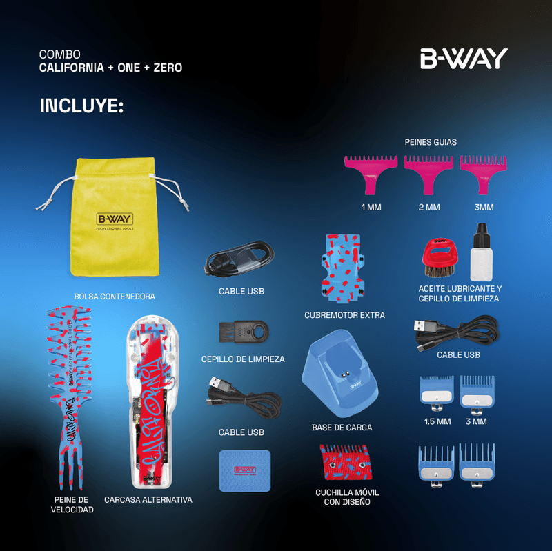 California Clipper Cortadora profesional para cortes completos y fades precisos. Motor de 8000 rpm y 12 W cuchilla DLC acanalada con hoja movil de zirconio. Bateria de 2600 mAh con hasta 240 minutos de uso continuo y carga USB rapida. Palanca de ajuste de altura 0 5 a 2 8 mm base de carga indicador LED y diseno ergonomico. Incluye 4 peines guia 1 5 6 mm peine guia especial tapa personalizada cubremotor aceite lubricante cepillo de limpieza y cable USB. One Trimmer Patillera de precision para contornos lineas y detalles. Cuchilla de acero inoxidable diseno compacto y ergonomico. Incluye peines guia aceite cepillo de limpieza tapa extra y cable USB. Zero Shaver Afeitadora al ras con doble lamina flotante motor silencioso y bateria recargable. Ideal para retoques finales y zonas sensibles. Incluye tapa protectora cepillo de limpieza y cable USB. Beneficios del combo solucion completa para corte perfilado y afeitado profesional. Equipos precisos versatiles portatiles y faciles de mantener.