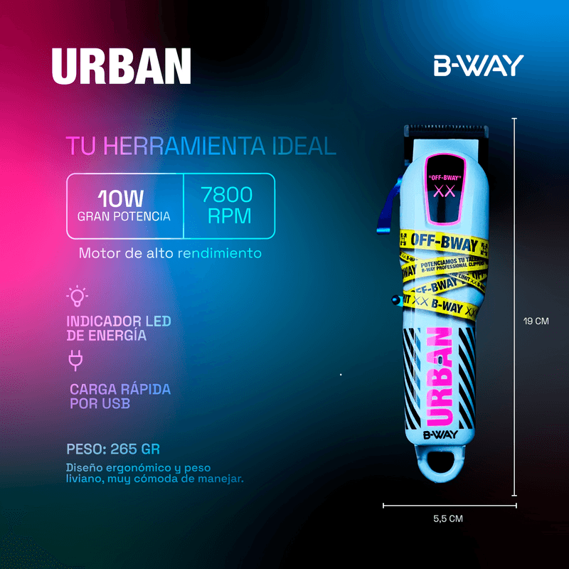 BWAY Faster Cortadora de pelo inalambrica de alta precision. Motor de 7800 RPM y 12 W. Bateria de litio de 2500 mAh con hasta 4 horas de autonomia y carga rapida en 3 horas. Palanca de regulacion de altura de corte libre rango de corte de 0 8 mm a 2 5 mm. Diseno ergonomico y liviano 265 g 19 x 6 cm. Incluye 6 peines guia 1 5 3 4 5 6 10 13 mm aceite lubricante cepillo de limpieza peine de velocidad banda antideslizante y cable USB. BWAY Urban Maquina profesional para cortes precisos en barberias o uso personal. Motor de 7800 RPM y 10 W bateria de litio de 2200 mAh con hasta 240 minutos de uso y carga completa en 3 horas. Cuchilla fija concava con cuchilla movil luz LED indicadora de energia. Incluye cortadora profesional 2 peines guia premium 1 5 mm y 4 5 mm aceite lubricante cepillo de limpieza y cable USB. Beneficios herramientas precisas versatiles y confiables ideales para cortes completos y detalles profesionales. Garantia oficial de 6 meses y servicio tecnico especializado con repuestos originales