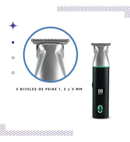 Equipado con una pantalla LED digital, el modelo EB-TR143I permite seleccionar entre tres niveles de corte, adaptándose a diferentes estilos y preferencias. Su potente batería ofrece hasta 120 minutos de uso continuo, asegurando que puedas realizar cortes sin interrupciones. Además, su tiempo de carga de 120 minutos garantiza que siempre esté lista para usar.