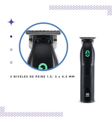 Equipado con una pantalla LED digital, el modelo EB-TR85I permite seleccionar entre tres niveles de corte, adaptándose a tus necesidades específicas. Su funcionamiento inalámbrico y su batería de larga duración, que ofrece hasta 180 minutos de uso continuo, la hacen perfecta para llevar en viajes o para usar en cualquier lugar sin complicaciones.