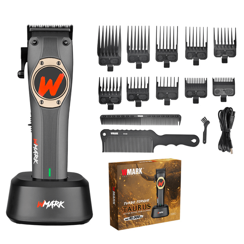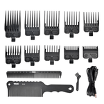 - Accesorios: 10 peines guía (1,5/3/4,5/6/10/13/16/19/22/25 mm), cepillo de limpieza, aceite lubricante, cable de carga USB tipo C y base de carga, dos peines, dos adhesivos para el cabello y una capa de corte.