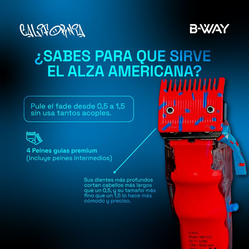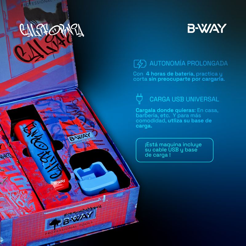 Maquina de cortar pelo profesional inalambrica BWAY California disenada para cortes tipo fade con maxima precision. Incorpora cuchilla fija DLC plana y acanalada junto a cuchilla movil de zirconio. Su motor alcanza 8000 rpm con potencia de 12 W ofreciendo un corte fluido y sin tirones. Equipada con bateria de 2600 mAh que brinda hasta 240 minutos de autonomia carga completa en 3 horas por USB y base de carga incluida. Dispone de indicador LED de bateria y palanca de ajuste de altura de 0 5 a 2 8 mm. Incluye peines guia resistentes 1 5 3 4 5 y 6 mm peine especial peine texturizador aceite lubricante cepillo de limpieza cable USB base de carga y accesorios adicionales. Beneficios maquina potente ergonomica y precisa ideal para profesionales o usuarios exigentes