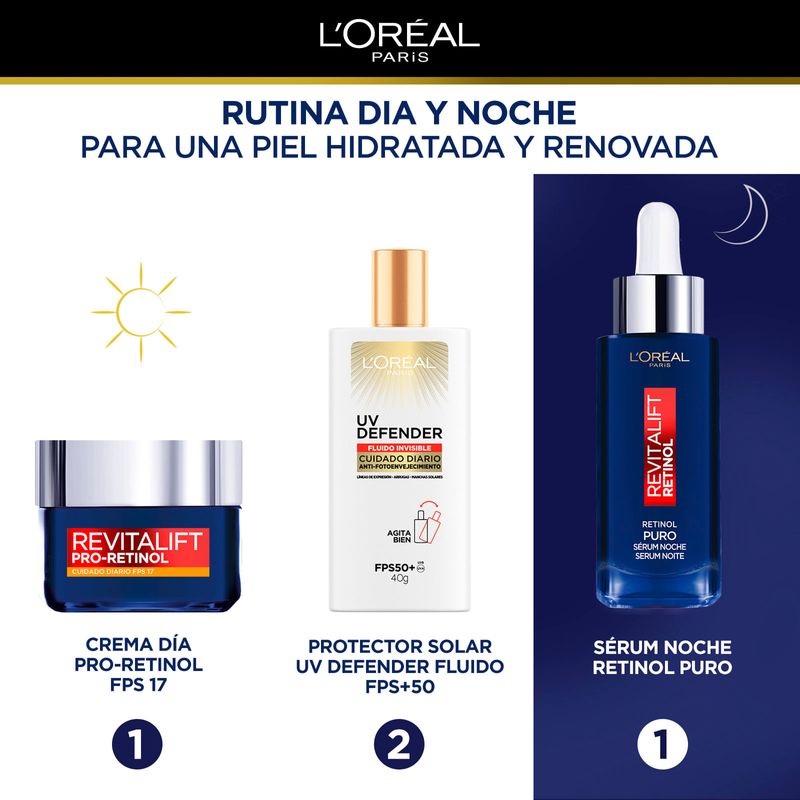 Para una rutina más completa podes usar el Sérum Noche Revitalift Retinol unicamente por la noche. A la mañana siguiente aplicá la crema dia Pro