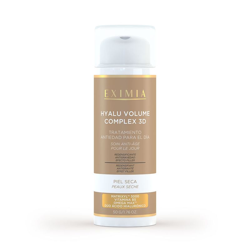 Eximia Hyalu Volume Complex 3D es una crema antiedad intensiva formulada especialmente para pieles secas. Enriquecida con un complejo de ácido hialurónico de alto, medio y bajo peso molecular, hidrata en profundidad, mejora la elasticidad y ayuda a redensificar la piel desde el interior.