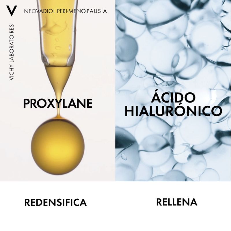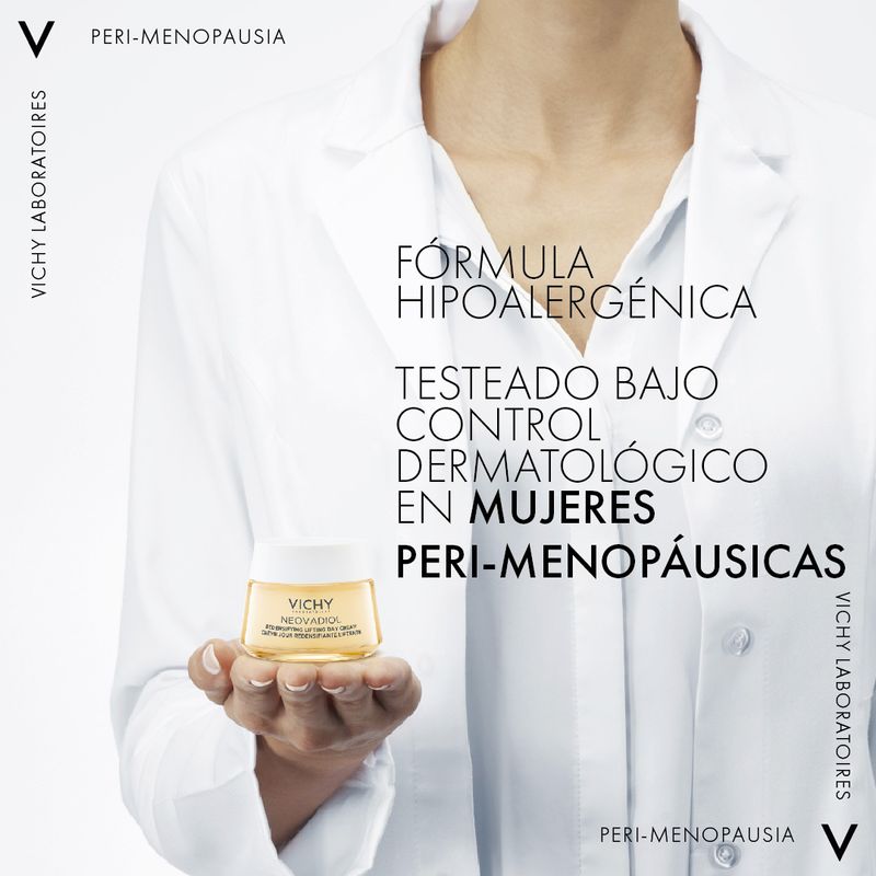 En la peri-menopausia, las variaciones hormonales aceleran los signos del envejecimiento de la piel que causan la pérdida de elasticidad, densidad y definición del contorno facial. Neovdaiol Peri Menopausia crema de día redensificante reactiva los mecanismos antiedad de pieles secas durante la menopausia: elasticidad, firmeza y sequedad. Gracias a su composición con ácido hialurónico, proxylane y extracto de cassia que mejora visiblemente los signos de envejecimiento provocados por los cambios hormonales, mejora el aspecto general de la piel, redefine el contorno del rostro, ayuda a suavizar la piel mientras hidrata y unifica el tono de piel.