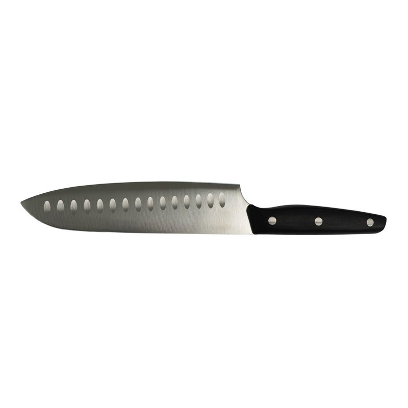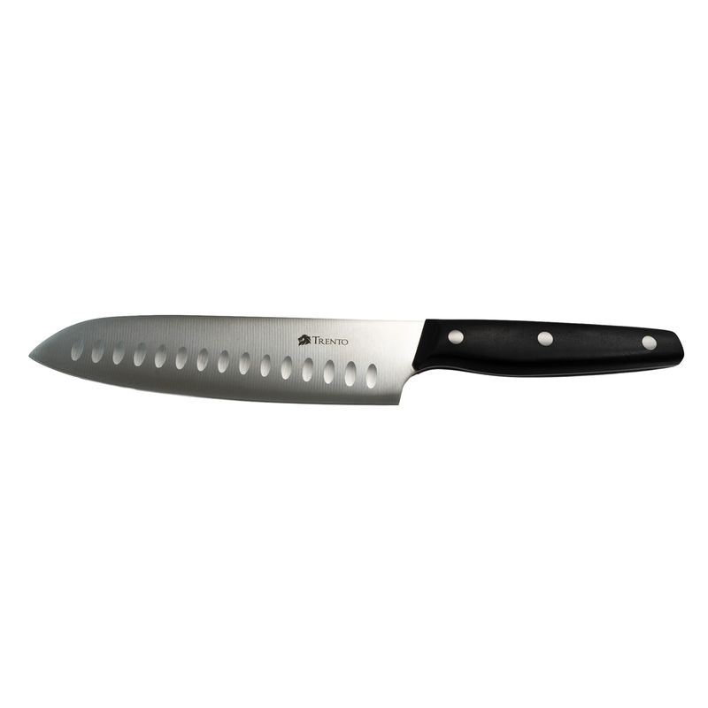 El cuchillo de cocina Trento Santoku de 7 pulgadas es la herramienta de precisión definitiva para tu hogar. Inspirado en el diseño tradicional japonés, es ideal para tres funciones clave: rebanar, picar y trocear con absoluta facilidad. Su hoja de acero inoxidable AISI 420 garantiza un filo liso duradero y una resistencia superior a la corrosión, mientras que su mango de madera Pakka negra ofrece un agarre ergonómico, resistente a la humedad y de gran elegancia estética.