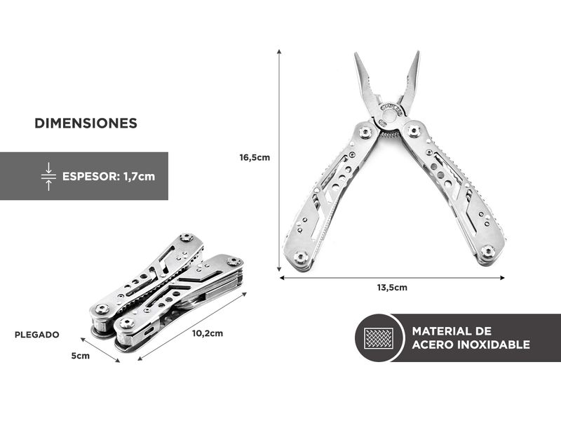 Podrás usar esta herramienta como destornillador, lima, cuchila, sierra, alicate, destapador, abre latas ¡y más!