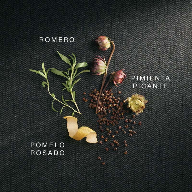 • La fragancia se abre con la frescura del pomelo rosa y el romero, con un toque de pimienta ardiente.