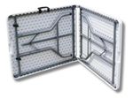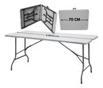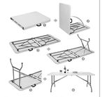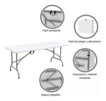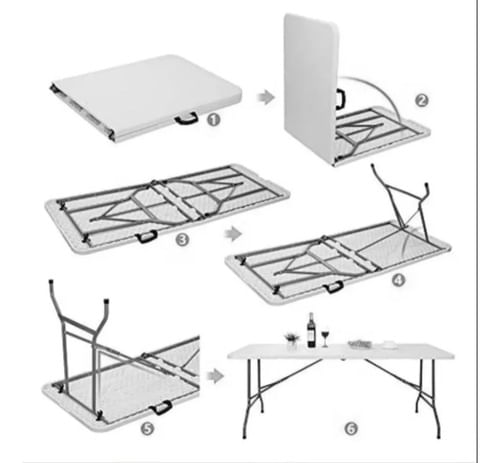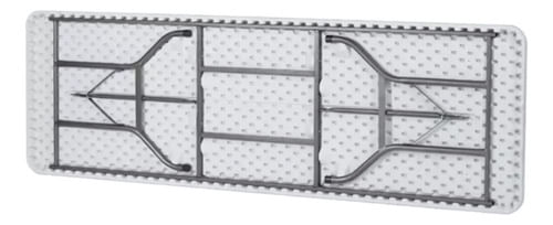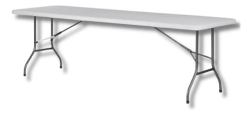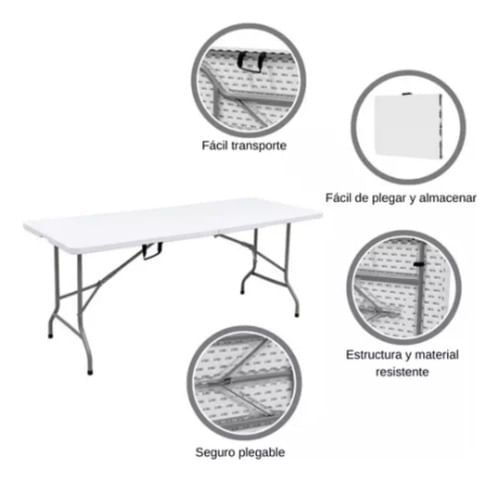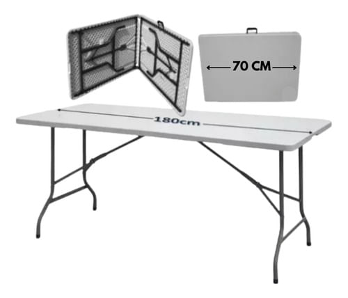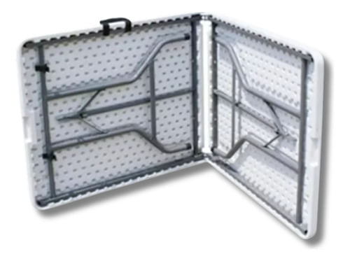 Mesa plegable, tapa de plástico reforzado blanco y estructura de tubo de acero color gris, Cuenta con traba de seguridad y manija para transportar