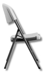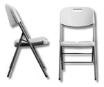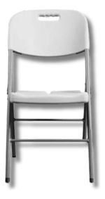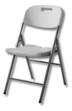 Silla plegable de plástico reforzado blanco y estructura de tubo de acero color gris. Cuenta con una manija para transportar