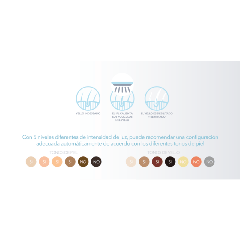 • Cinco niveles de intensidad, que te permiten ajustar la potencia según tu tipo de piel y vello.