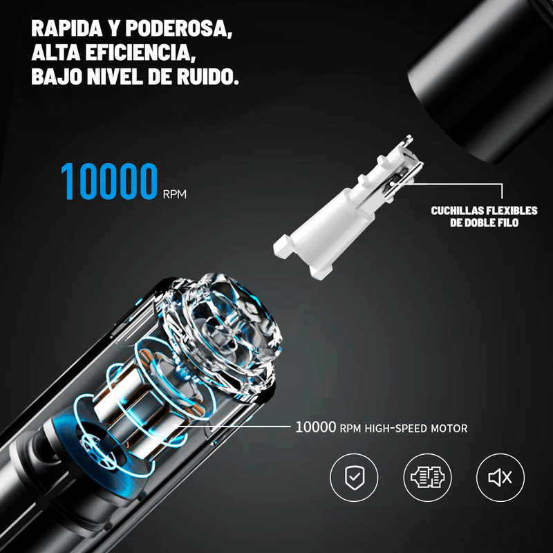 Elimina fácilmente el vello no deseado. La rotación de alta velocidad garantiza un corte rápido y eficiente, y el diseño de doble cuchilla protege tu piel de cortes y rasguños.