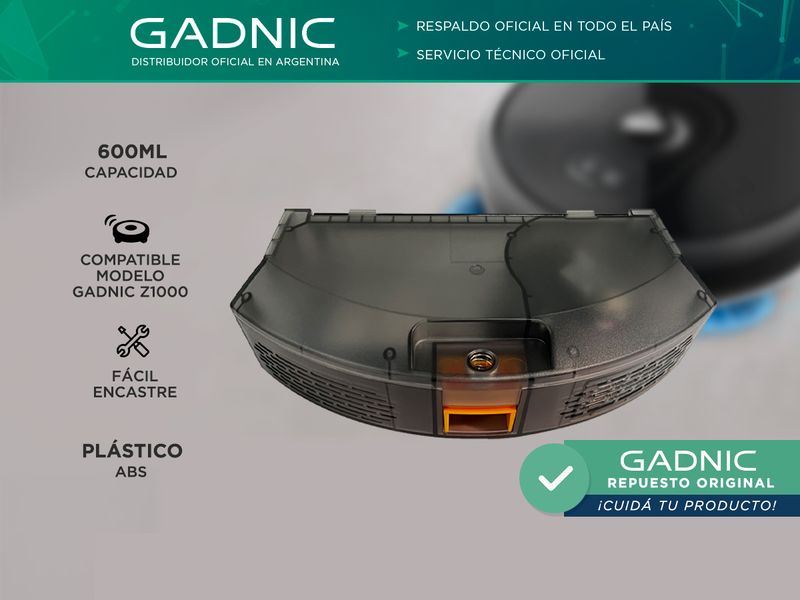 Mantené tu Aspiradora Robot Gadnic Z1000 en óptimas condiciones con nuestro Depósito de Polvo de Repuesto. Diseñado específicamente para este modelo, garantiza una recolección eficiente de suciedad y polvo, asegurando un rendimiento óptimo en cada limpieza. Su instalación es rápida y sencilla, permitiéndote volver a disfrutar de la comodidad de tu robot aspirador en poco tiempo. No dejes que un depósito lleno interrumpa tu limpieza; reemplazalo y mantené tu hogar impecable. ¡Una solución práctica y efectiva para un hogar libre de suciedad!