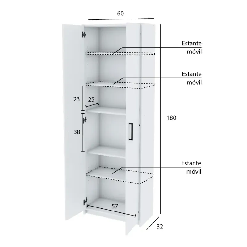 Mueble organizador de 1,80mts. de altura para todo tipo de ambiente. En su interior cuenta con tres estantes regulables según las necesidades de guardado. En la cocina, en el lavadero, en el garage, en un cuarto; un infaltable del hogar.