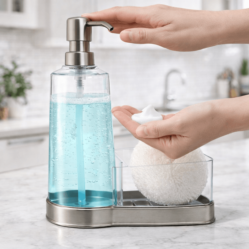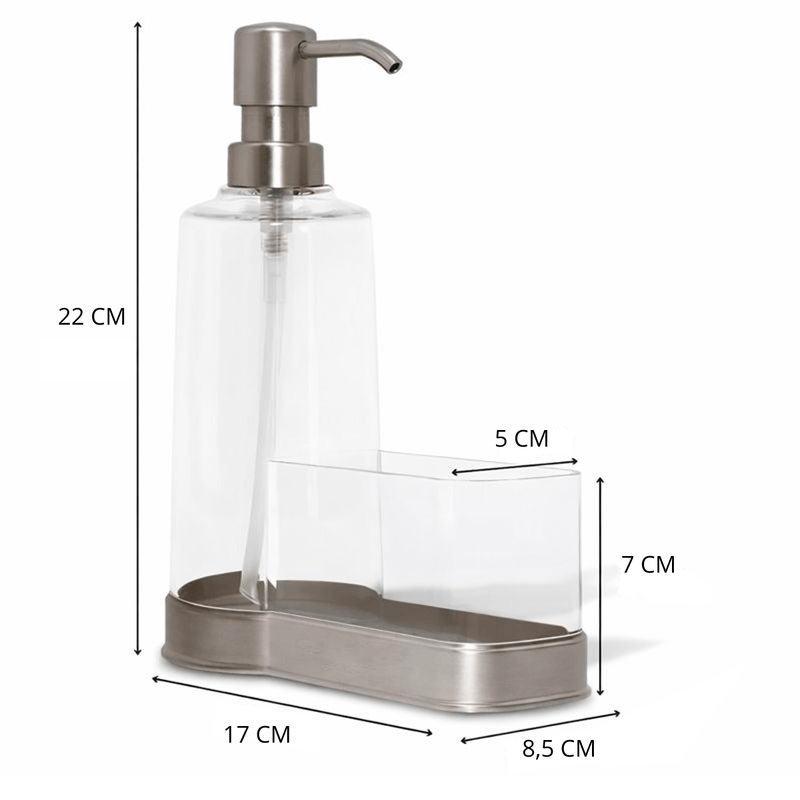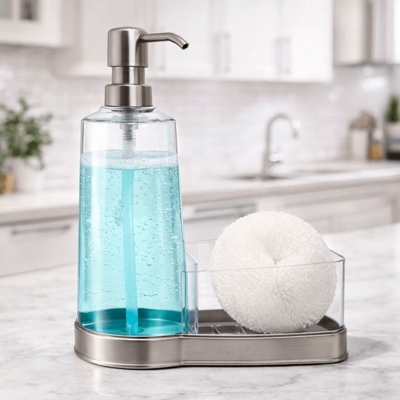 Incluye una esponja y compartimento integrado para la misma, manteniendo la mesada limpia y ordenada. La base niquelada no solo aporta un acabado elegante y premium, sino que también brinda estabilidad, resistencia a la humedad y fácil limpieza.