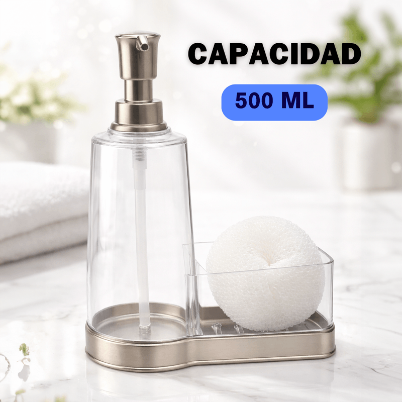 Dispensador con porta esponja Hogar Actual, cuenta con una estructura de plástico ABS y acrílico resistente, su diseño es adecuado para el uso continuo. Tiene una capacidad de 500 ml, compatible con cualquier tipo de detergente líquido.