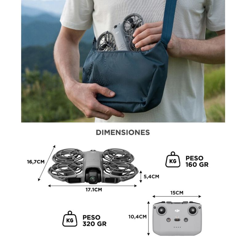 - 167×171×54 mm (L×A×H, con protectores de hélices y transceptor digital DJI Neo 2)