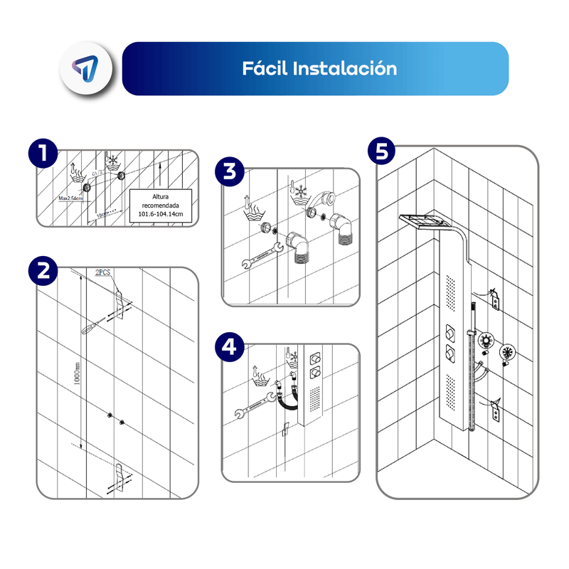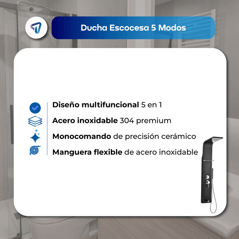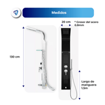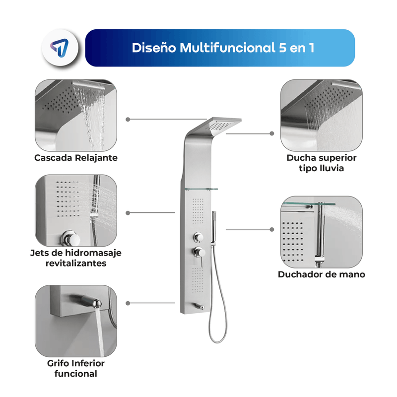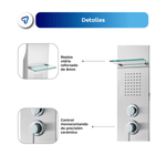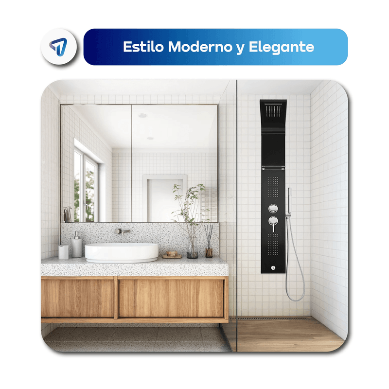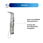 La Columna de Ducha WAGGS transforma tu baño en un verdadero spa gracias a su diseño multifuncional 5 en 1 que combina ducha tipo lluvia, cascada, jets de hidromasaje, duchador de mano y grifo inferior. Fabricada en acero inoxidable 304 con repisa de vidrio reforzado de 8 mm, ofrece durabilidad, estilo y comodidad. Incluye monocomando de cierre cerámico para un control preciso, manguera de 1,5 m en acero inoxidable, conexiones estándar de 1/2'' y un kit completo de instalación. Medidas: 130 × 20 cm, con mezclador y divisor de latón y componentes en ABS de alta resistencia. Una solución elegante y funcional para renovar tu baño con una experiencia de relajación diaria.