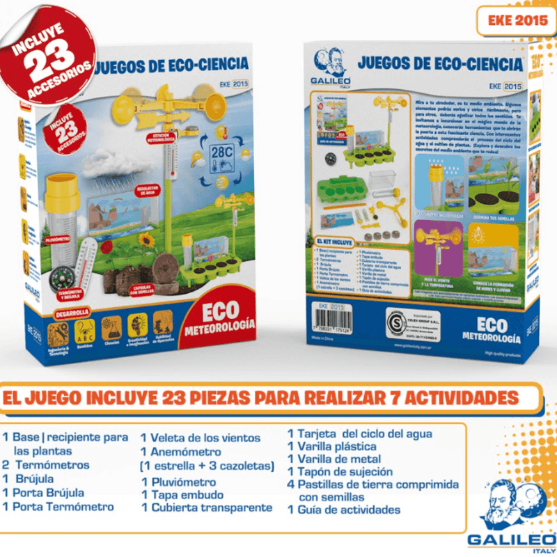 El kit incluye: 1 Base | recipiente para las plantas, 2 termómetros, 1 brújula, 1 porta brújula, 1 porta termómetro, 1 veleta de los vientos, 1 anemómetro (1 estrella + 3 cazoletas), 1 pluviómetro, 1 tapa embudo, 1 cubierta transparente, 1 tarjeta del ciclo del agua, 1 varilla plástica, 1 varilla de metal, 1 tapón de sujeción, 4 pastillas de tierra comprimida con semillas, 1 guía de actividades.