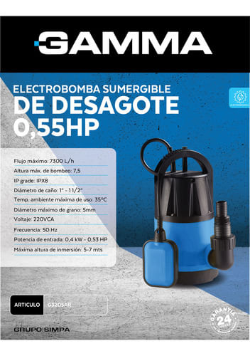 La Electrobomba Sumergible de Desagote 0.55 Hp Gamma G3205ar es la solución ideal para quienes buscan eficiencia y rendimiento en el manejo de agua. Con una potencia de 404.25 W, esta bomba es capaz de alcanzar un caudal máximo de 121.667 litros por minuto, lo que la convierte en una herramienta indispensable para el desagote de aguas sucias.