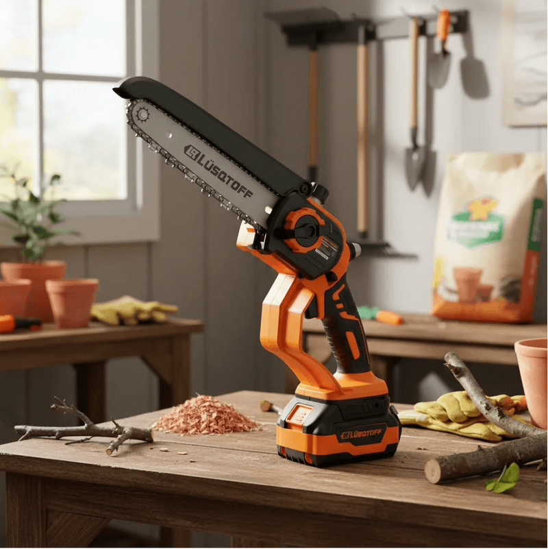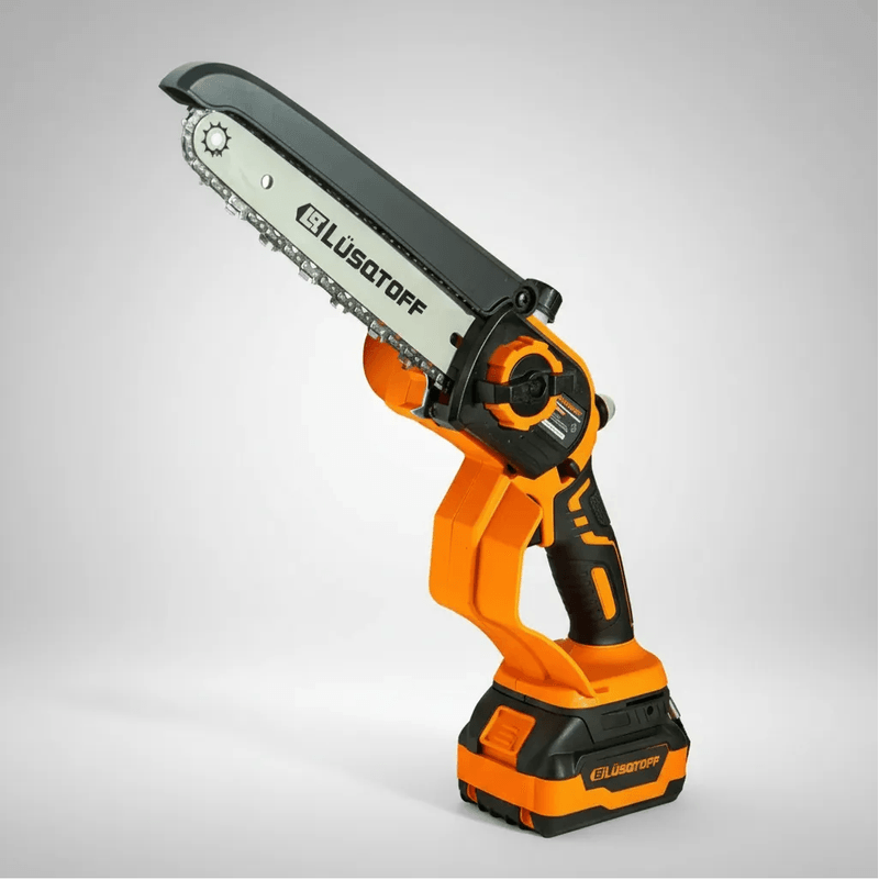 La electrosierra a batería Lüsqtoff MML80-8B cuenta con una espada de 8 pulgadas (aprox. 20 cm) y un diseño compacto y ligero, pesando solo 1.6 kg. Está equipada con un motor de 18 V, ajuste de cadena, depósito de aceite interno con lubricación por botón y una velocidad de cadena de