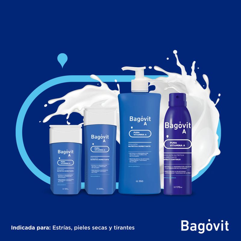 La Emulsión Nutritiva Humectante Bagóvit A es de textura fluida. Su fórmula hidro emulsionada permite que la Vitamina A penetre rápidamente, favoreciendo una placentera y suave aplicación en todo el cuerpo. Restituye la firmeza, vitalidad y luminosidad de la piel. Es hipoalergénica.