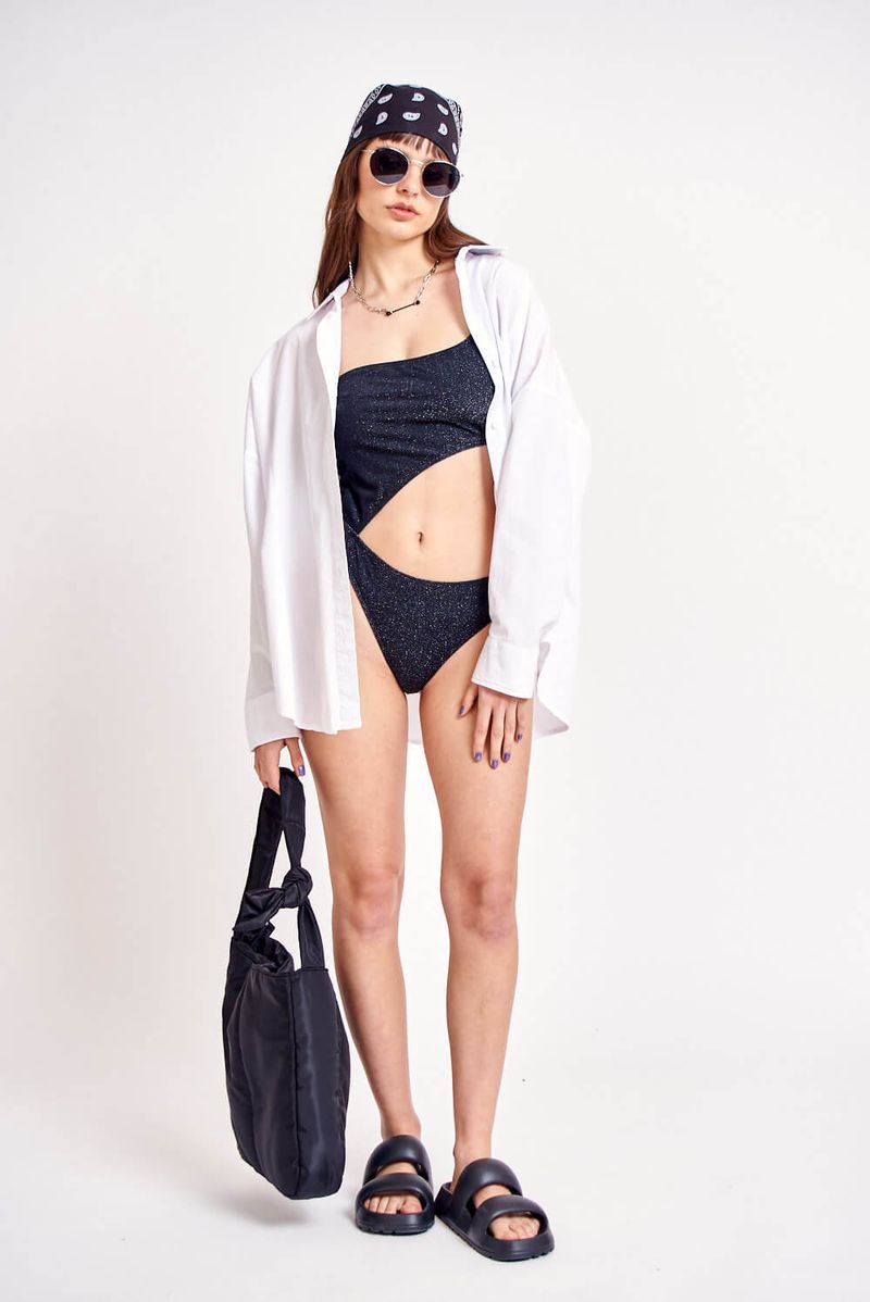 Entera en calidad de lurex. Modelo de un hombro con calado en un lateral.