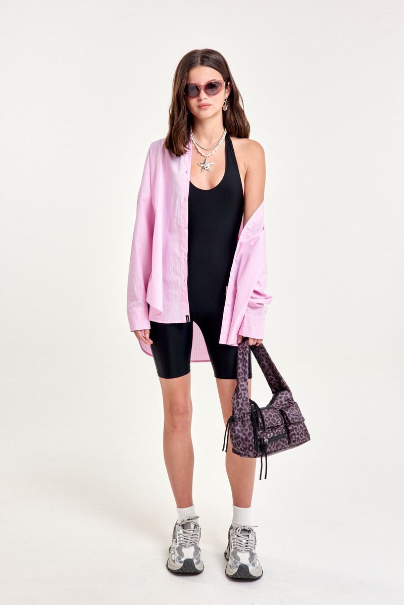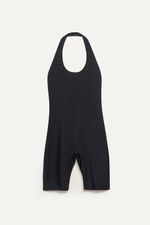 Entero de tricot con cuello halter y elástico en escote delantero y espalda. Lleva etiqueta de la marca de goma mini en espalda. Versátil y cómodo, queda increíble con camperas oversize o camisas abiertas.