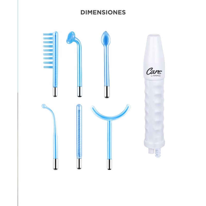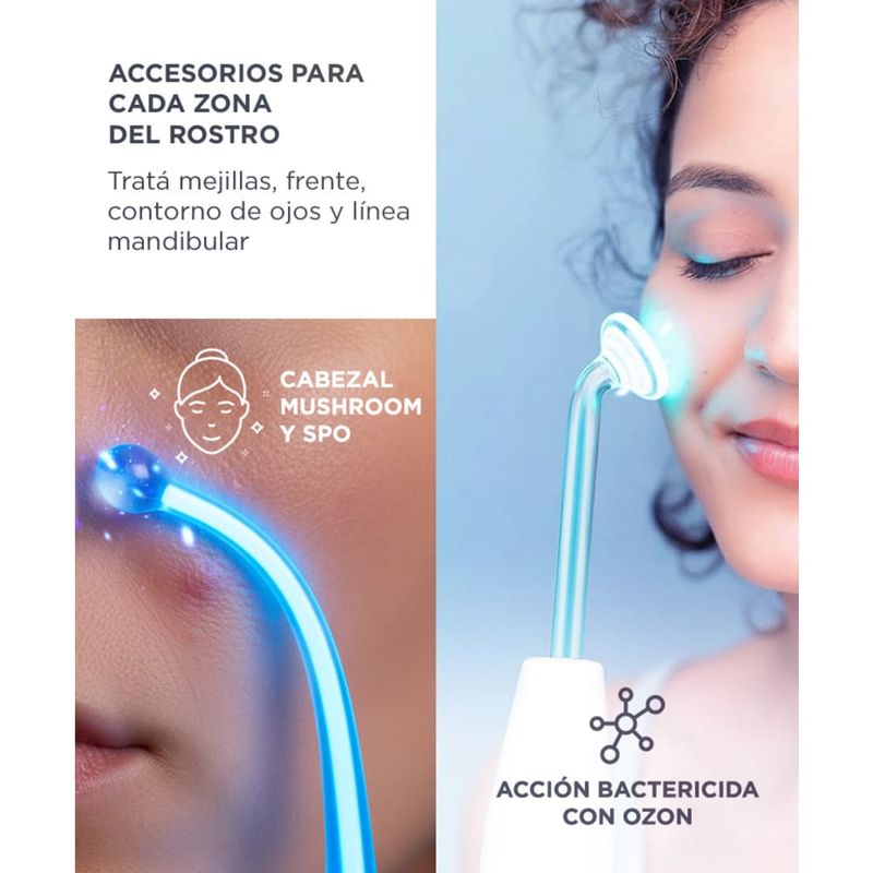 El dispositivo incluye seis cabezales intercambiables para tratar zonas específicas del rostro y cuerpo, mejorando la textura de la piel y reduciendo imperfecciones.