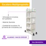 Fabricada en aluminio de alta calidad con bisagras de acero y un espesor de 1 mm, garantiza una gran resistencia y durabilidad. Esta escalera soporta hasta 150 kg (120 kg en movimiento), lo que asegura un uso seguro para una persona más sus materiales. Con un ancho de 34,5 cm y peldaños amplios de 30 cm, ofrece estabilidad y comodidad en cada escalón.