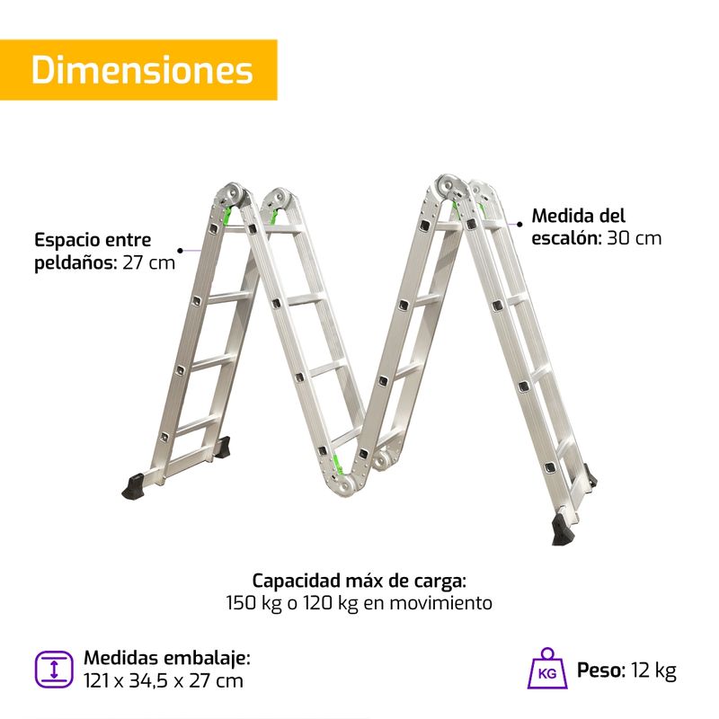 La Escalera Articulada Multifuncional 4x4 es la solución ideal para tus proyectos domésticos. Con una altura máxima de 4,50 metros, esta escalera es perfecta para diversas tareas en el hogar, como pintar, reparar o realizar trabajos en altura. Su diseño articulado permite utilizarla en múltiples posiciones: tijera (223 cm), andamio (121 cm) o completamente plegada (122,5 cm), ocupando poco espacio para su almacenamiento.