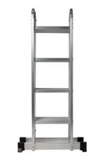 Fabricada en aluminio, combina ligereza y robustez, soportando hasta 150 kg de carga máxima. Sus bisagras de bloqueo con traba automática y los escalones antideslizantes brindan mayor seguridad durante el uso, mientras que las barras estabilizadoras y los pies angulares de goma aseguran firmeza en distintas superficies.