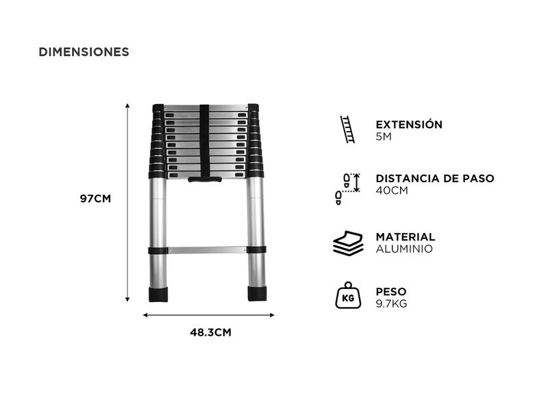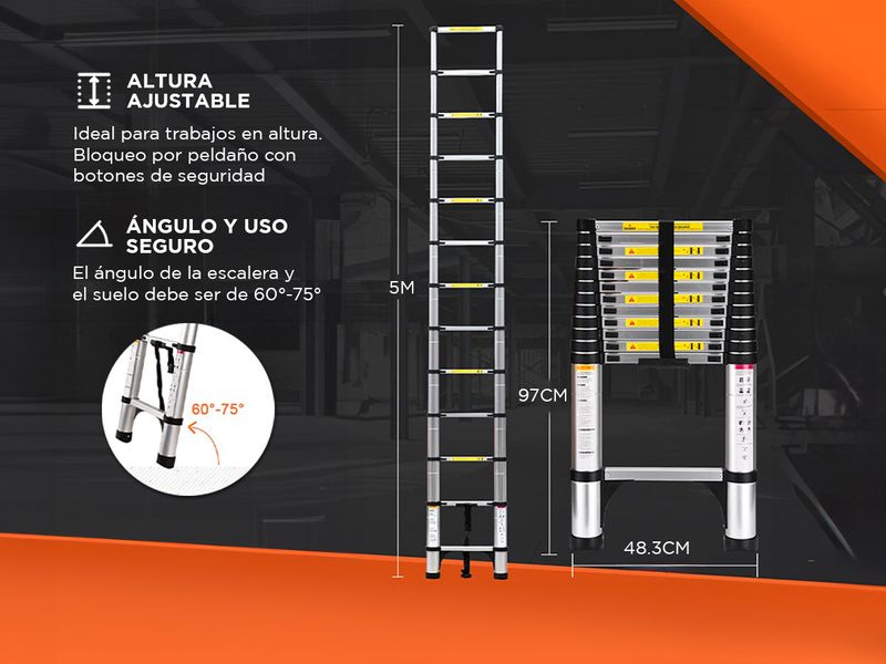Altura Ajustable: La escalera se puede extender hasta 5 metros, lo que la hace ideal para una variedad de trabajos en diferentes alturas.