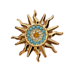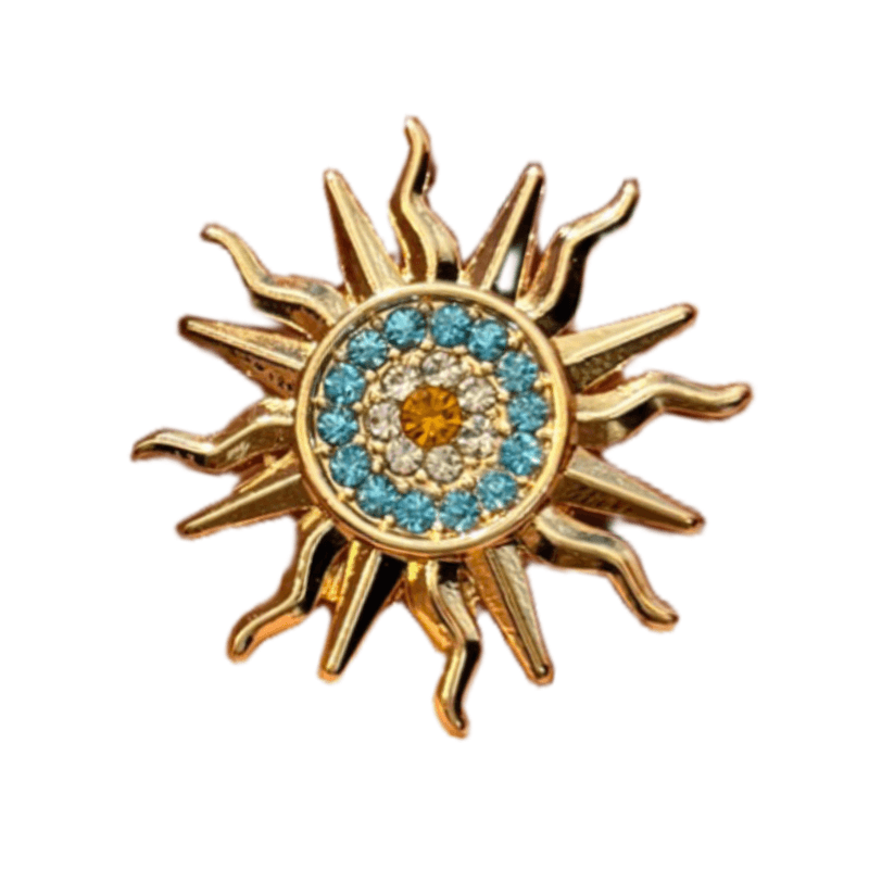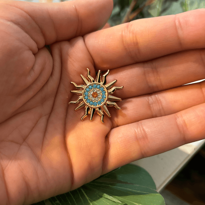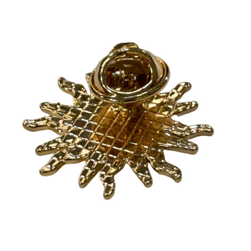 La escarapela Sol es un pin de diseño circular con forma de sol, trabajado en metal con terminación brillante.
