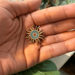 En el centro presenta un cristal ámbar que aporta un punto de luz cálido, rodeado por dos hileras de pequeños cristales: una en tono blanco y otra en celeste, generando un efecto delicado y luminoso