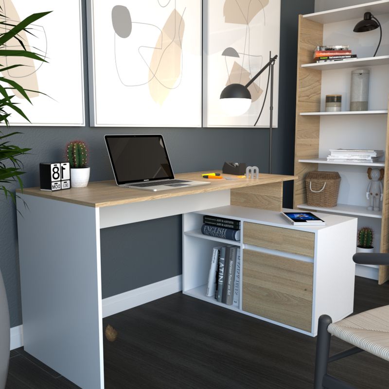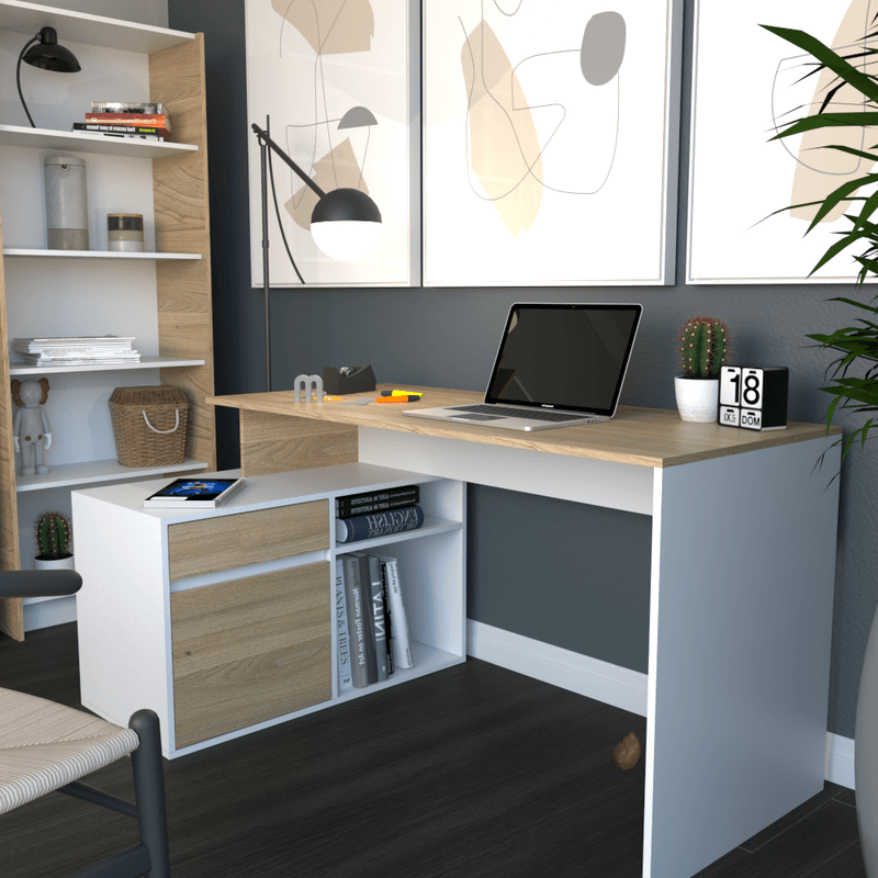 Optimiza tu espacio de trabajo con el escritorio en L ideal para tu oficina, con 1 puerta, cajón y correderas metálicas.