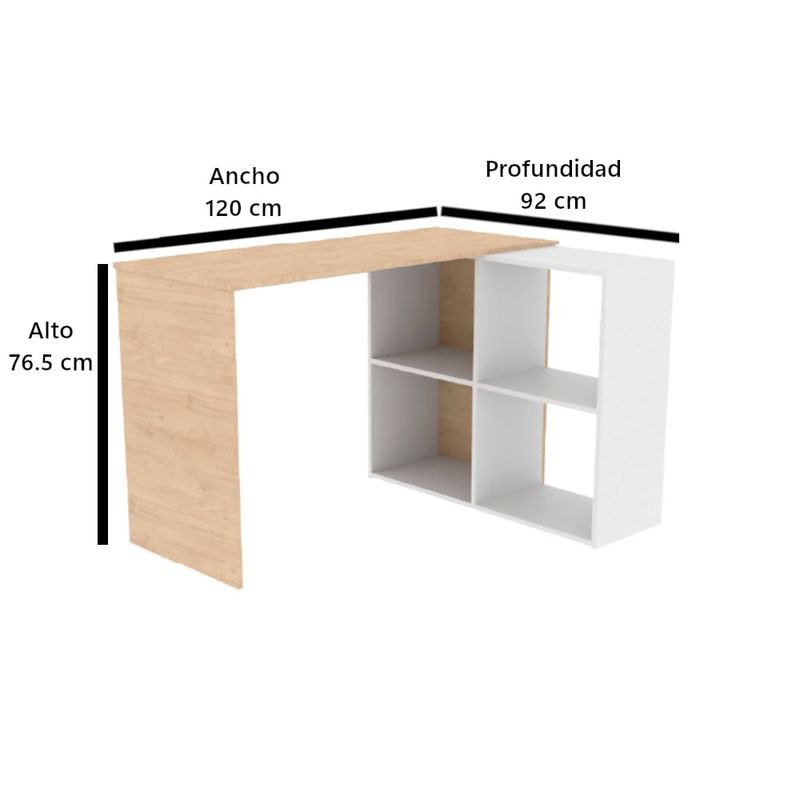 Compacto, funcional y de fácil limpieza, el ES0004 combina tapa en tono madera con biblioteca Blanco/Roble de 4 cubos. Medidas exactas del mueble armado: 120 × 92 × 76 cm (ancho × profundidad × alto), ideal para home office, estudio o dormitorio. Requiere armado e incluye herrajes y manual. El diseño aprovecha rincones y mantiene libros, periféricos y cajas organizadas sin ocupar de más.