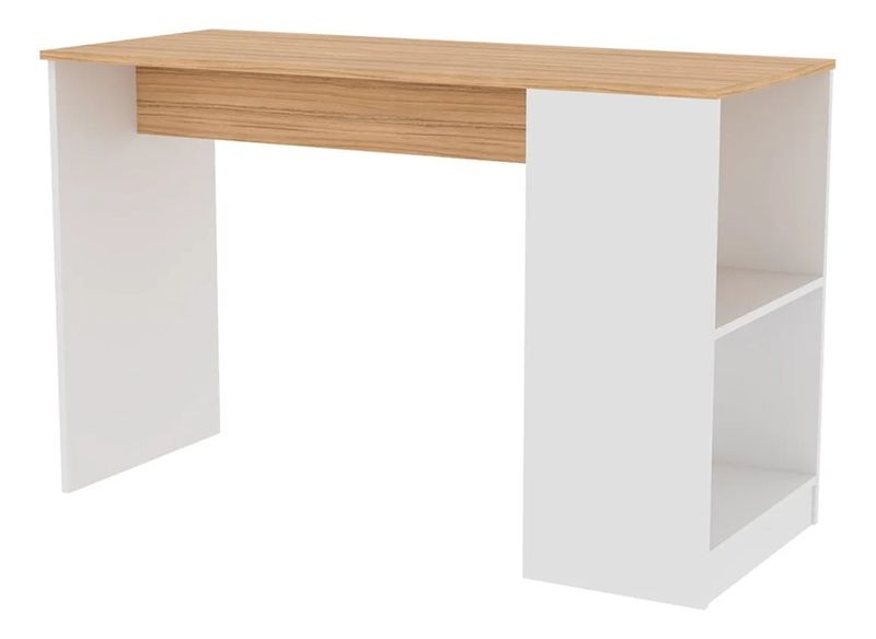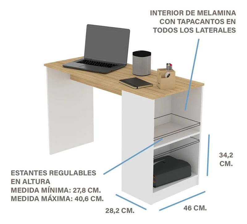 La estructura en melamina de 15 mm ofrece resistencia y limpieza simple para el uso cotidiano. Su tapa amplia permite acomodar notebook, monitor y útiles sin amontonarlos, mientras que los estantes integrados mantienen todo a mano. La altura está diseñada para una postura cómoda durante largas jornadas y el diseño bicolor se integra fácil a distintos estilos de ambiente.