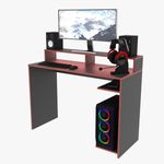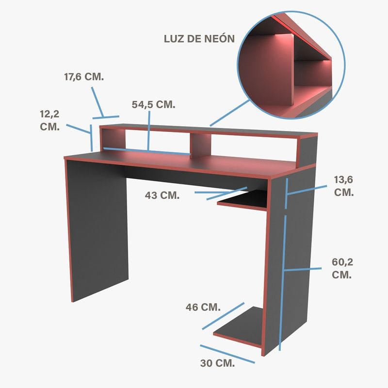Este escritorio está pensado para los gamers. Cuenta con iluminación LED integrada para que puedas personalizar la atmósfera de tu espacio y crear un ambiente inmersivo. La repisa elevada para monitor es un gran diferencial, ya que te ayuda a mantener una postura correcta y reduce la fatiga visual, permitiéndote jugar o trabajar cómodamente durante largas horas.