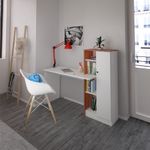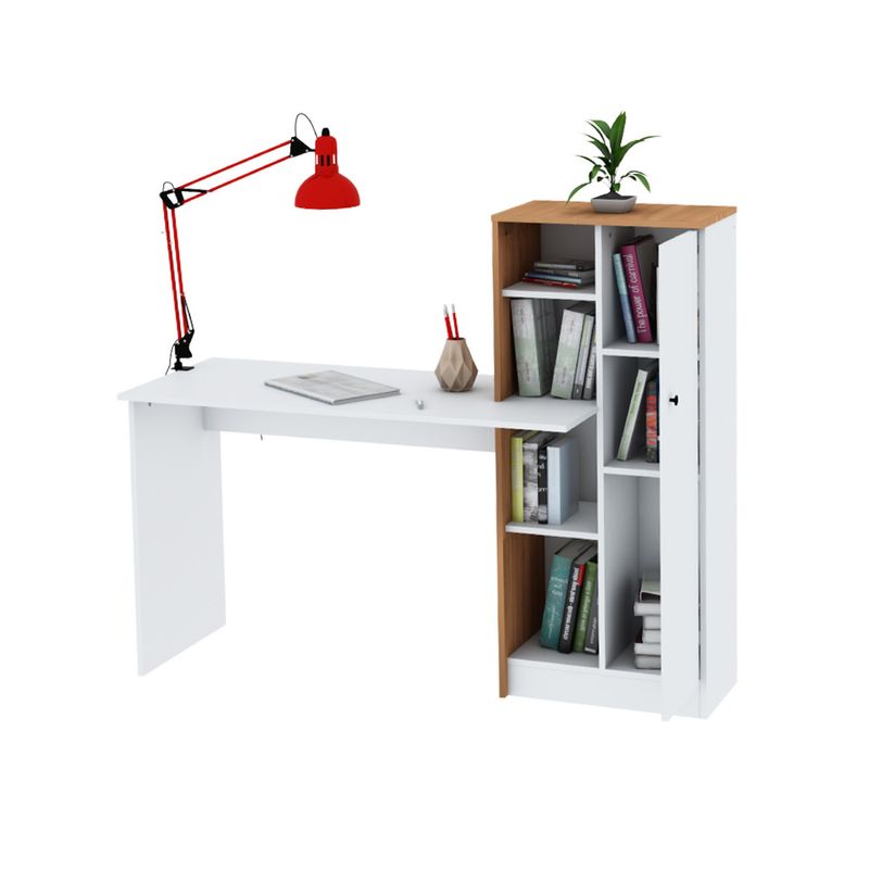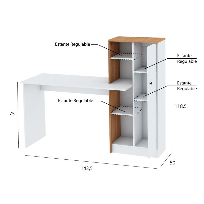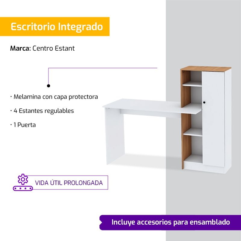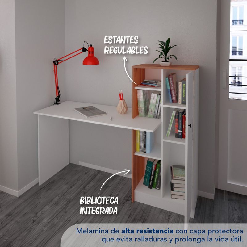 Escritorio de melamina de un tamaño ideal para ubicarlo en cualquier rincón de la casa. Se puede adaptar a una pared amplia como a cualquier otro sector. Contiene un mueble organizador para que organices tu hogar como más te guste.
