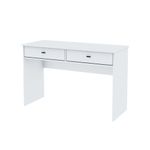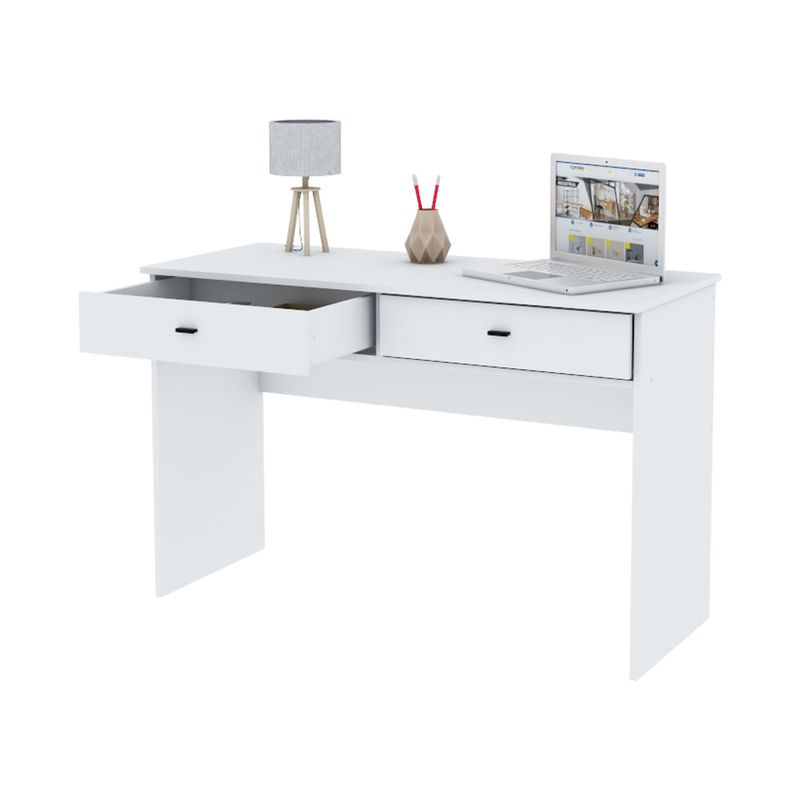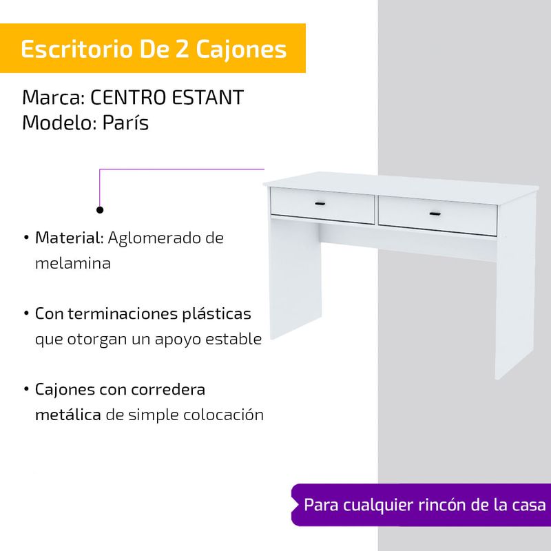 Escritorio de melamina de un tamaño ideal para ubicarlo en cualquier rincón de la casa. Contiene dos cajones para organizar tus apuntes o material de