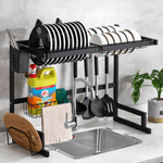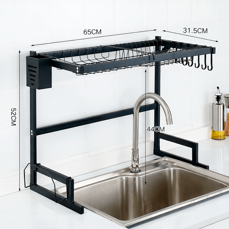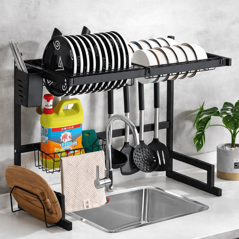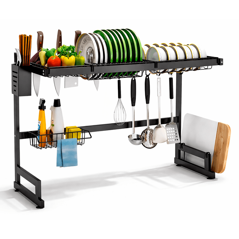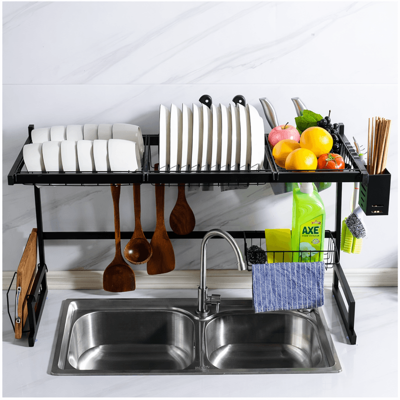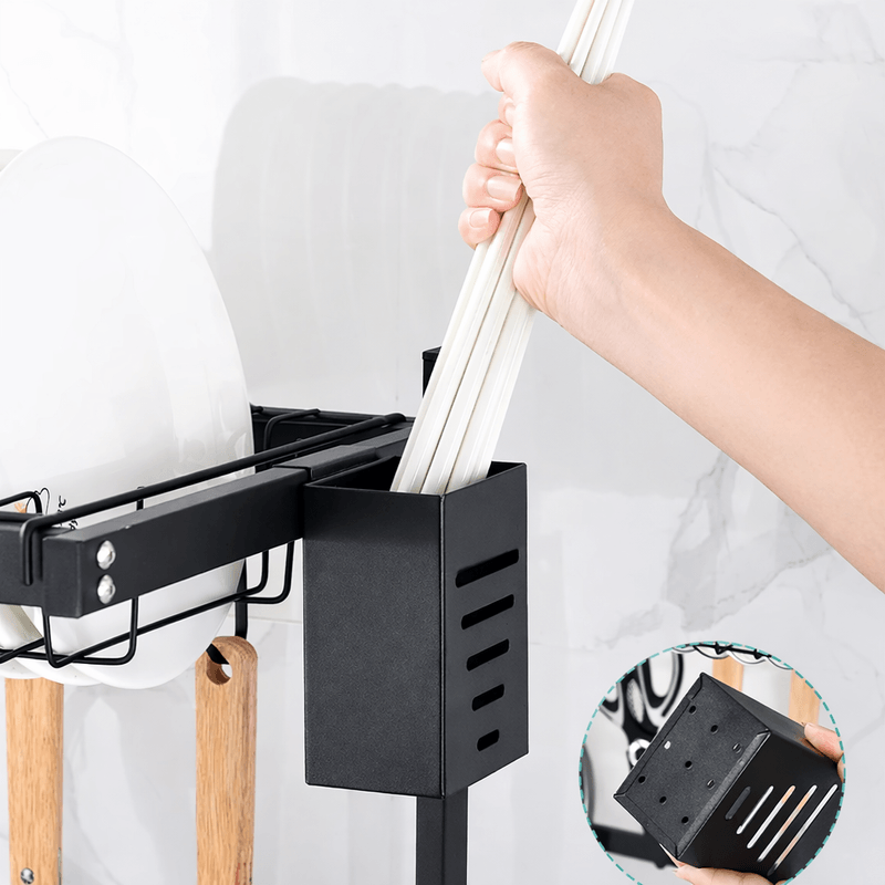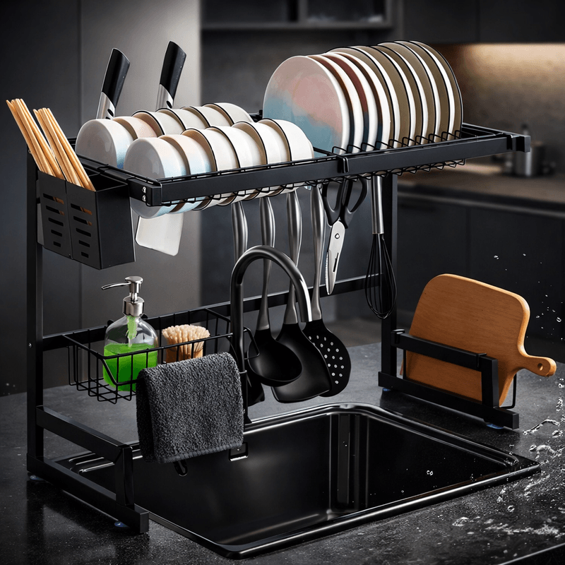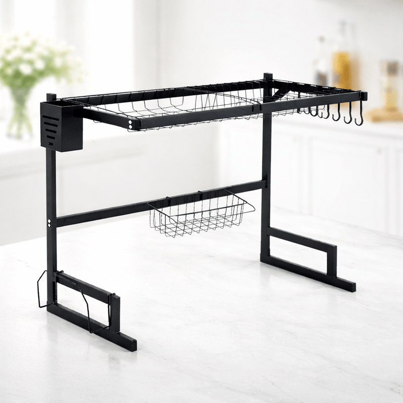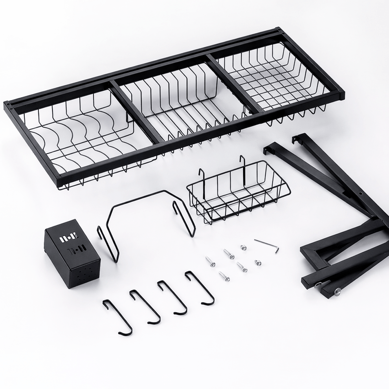 Escurreplatos diseñado para colocarse sobre la bacha, ideal para optimizar el espacio en la cocina y mantener el área de lavado ordenada y funcional. Fabricado en acero al carbono de alta resistencia, con acabado negro mate, combina durabilidad, estabilidad y un diseño moderno.