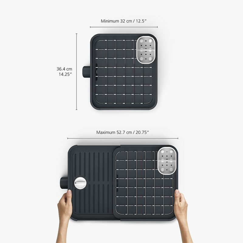 Creamos Extend™ para que lavar los platos sea una tarea mucho más fácil. Nuestro escurridor de platos expandible se extiende al doble de su tamaño para adaptarse a más artículos. Además, tiene un pico móvil para drenar el agua, un espacio de drenaje dedicado para cubiertos y nervaduras elevadas que evitan que el agua quede atrapada debajo de vasos y cuencos.