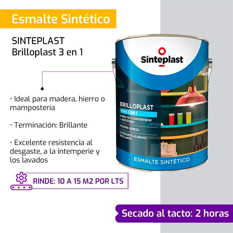 Esmalte sintético, convertidor y antióxido para interiores y exteriores. Posee una película dura y brillante que otorga resistencia a la suciedad, al desgaste, a los lavados y a los agentes atmosféricos.