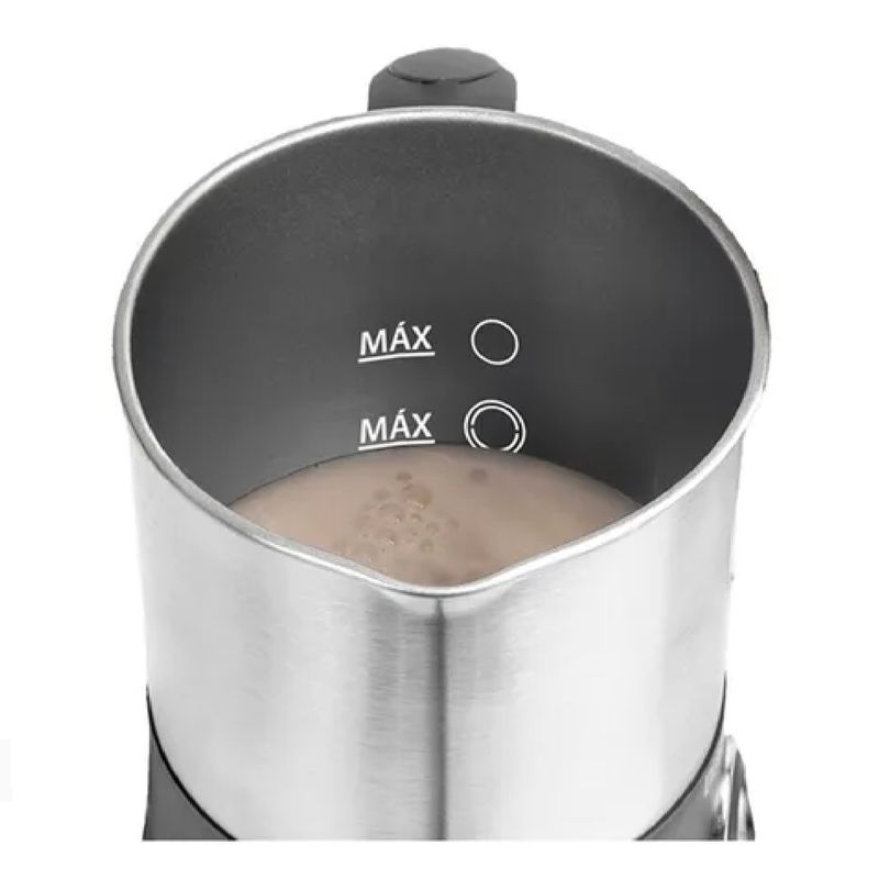 Su jarra de acero inoxidable con capacidad de hasta 400ml de leche y 225ml de espuma, garantiza durabilidad y calidad en cada uso. Además, su diseño ergonómico y base antideslizante aseguran una manipulación cómoda y segura.