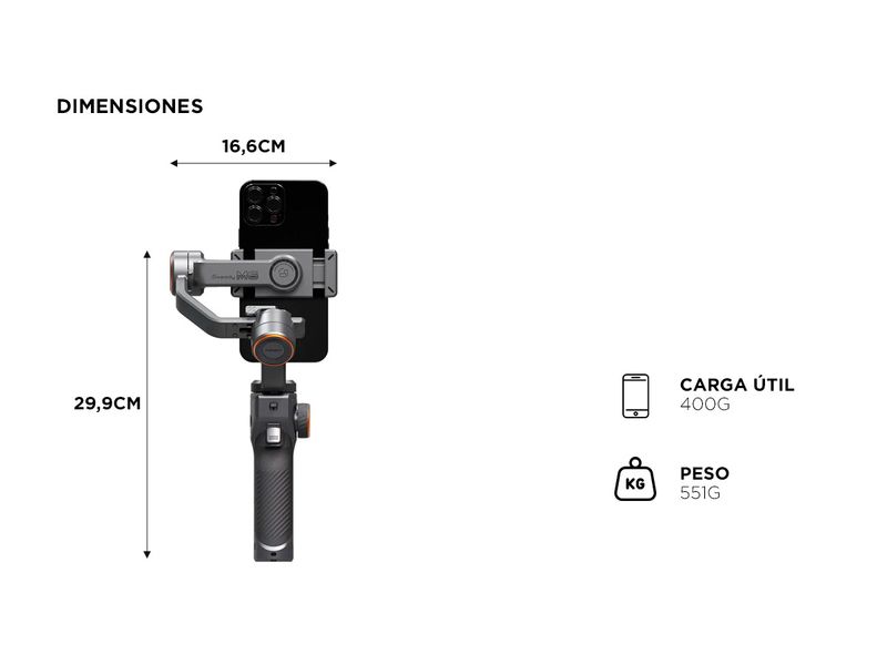 Con un diseño compacto y ligero, su cardán de 551 g, fabricado con materiales compuestos de alto rendimiento, soporta una carga útil de hasta 400 g. Compatible con móviles de 58 mm a 98 mm de ancho, su rango mecánico permite rotaciones de 360° y movimientos fluidos en 335°, tanto en giro como en inclinación.