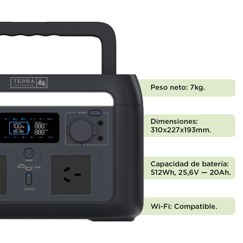 - Batería LiFePO₄ de 512Wh (25,6V—20Ah) que ofrece hasta 3000 ciclos de vida útil, garantizando durabilidad y seguridad superior.