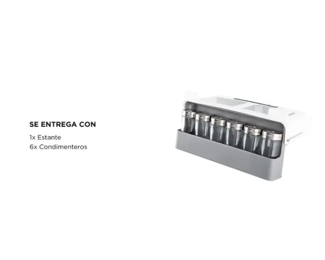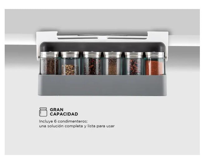 Con 6 condimenteros incluidos, este estante ofrece una solución de almacenamiento amplia y conveniente para una variedad de especias y condimentos. Su diseño rebatible te permite acceder fácilmente a tus condimentos favoritos, lo que facilita la preparación de tus platos y agiliza tu tiempo en la cocina.
